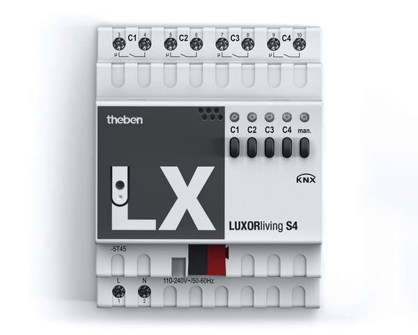 Schaltaktor mit Relaisausgängen für 4 Schaltkanäle für das Smart Home System LUXORliving, LED Schaltzustandsanzeige für jeden Kanal, Handschalter mit Statusanzeige (auch ohne Busspannung), Kontaktart (Öffner/Schließer) und Teilnahme an Zentralbefehlen wie Dauer-Ein und Zentral-Schalten, Schaltfunktionen: Ein/Aus, Treppenlicht mit Vorwarnen, Rückmelde-Objekt für jeden Kanal, Zentral-Objekte mit und ohne Priorität