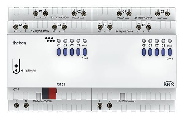 KNX Schaltaktor 8-fach C-Last mit Relaisausgänge für 8 Schaltkanäle, Reiheneinbaugehäuse, Breite 8 TE, LED Schaltzustandsanzeige je Kanal, Handschalter mit Statusanzeige (auch ohne Busspannung), Verknüpfungen, Kontaktart (Öffner/Schließer) und Teilnahme an Zentralbefehlen wie Dauer-Ein, Dauer-Aus, Zentral-Schalten und Szene speichern/abrufen, Schaltfunktionen: Ein/Aus, Impuls, Ein/Aus-Verzögerung, Treppenlicht mit Vorwarnen nach DIN 18015-2, logische Verknüpfungen: Sperren, UND, Freigeben, ODER, Rückmelde-Objekt für jeden Kanal, Zentral-Objekte mit und ohne Priorität, Szenen abrufen und speichern (Objekt), Szenenobjekt für jeden Kanal