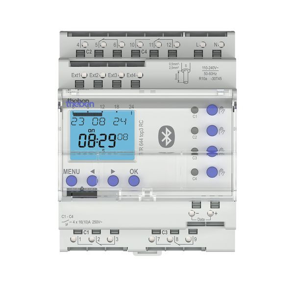 Digitale Zeitschaltuhr mit Jahresprogramm und Astro-Programm, DIN-Schiene, 4 Kanäle, 4 TE, App-Programmierung möglich durch integriertes BLE-Modul, Zeitsynchronisation durch Anschluss einer externen DCF- oder GNSS/GPS-Antenne, bei GNSS zusätzlich Positionsbestimmung für Astro-Programm, 2 externer Eingänge, DuoFix Federsteckklemmen, Textorientierte Bedienerführung im Display, 800 Speicherplätze, Schnittstelle für OBELISK top2 Speicherkarte (PC-Programmierung), 600 Watt LED-Leistung, 800 Ampere/200 Mikrosekunden Einschaltstrom, 0, 8 Watt Stand-by Leistung, 10 Jahre Gangreserve (Lithium-Batterie), Nulldurchgangsschaltung für relaisschonendes Schalten und hohe Lampenlasten, EIN-AUS Schaltzeiten, Impulsprogramm, Zyklusprogramm, Umfangreiche Jahresuhrfunktionen, Astronomische Schaltfunktion (automatische Berechnung der Sonnenauf- und Untergangszeiten für das ganze Jahr), Astro je Kanal auswählbar „3 Astrobereiche: Sonnenuntergang, Dämmerung, Dunkelheit, Schaltungsvorwahl, Dauerschaltung EIN/AUS, Zentral Dauer AUS „Einfachste Abschaltung in den Ferien“, Ablauf-Timer, Integrierter Betriebsstundenzähler, Ferienprogrammm, 2 Zufallsprogramme, Displaybeleuchtung (abschaltbar), PIN-Codierung, Automatische Sommer-/Winterzeitumschaltung, Earth Hour vorprogrammiert bis 2044