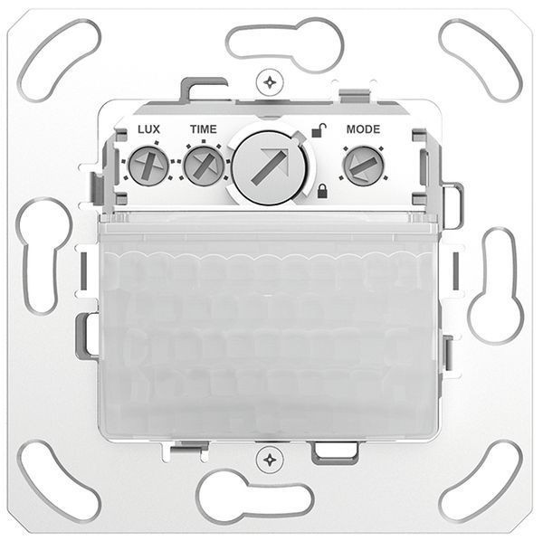 Passiv-Infrarot-Bewegungsmelder für UP-Wandmontage, 1 Kanal Licht, ohne Abdeckrahmen, Abdeckrahmen zur Integration in gängige Schalterprogramme als Zubehör erhältlich, halbrunder Erfassungsbereich 170° bis zu 14x17 m, Automatische präsenz- und helligkeitsabhängige Steuerung für Beleuchtung, Betrieb als Voll- oder Halbautomat, umschaltbar, Helligkeitsschaltwert einstellbar, Teach-in Funktion, Treppenlicht- und Impulsfunktion, Einschaltverzögerung und Nachlaufzeit einstellbar, Einschränkung des Erfassungsbereichs möglich, Integrierter Taster (blockierbar), Erweiterung des Erfassungsbereiches durch Master/Slave-Schaltung