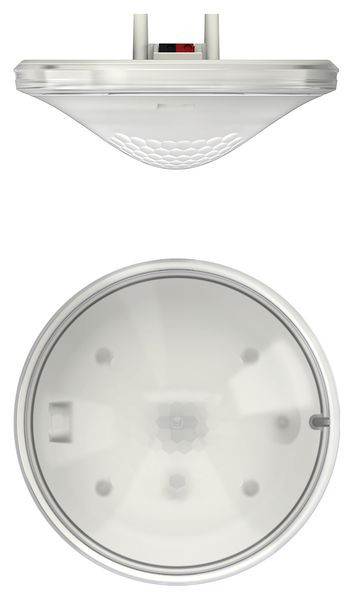 KNX-Präsenzmelder für Deckenmontage, Zwei Kanäle Licht zur Steuerung von zwei Lichtgruppen, Schalten oder Konstantlichtregelung, Betrieb als Voll-oder Halbautomat umschaltbar, Kanal Helligkeit mit zyklischer Ausgabe, Kanal für Raum-Überwachung, Verkürzung der Nachlaufzeit Licht bei kurzer Anwesenheit, Mischlichtmessung, Quadratischer Erfassungsbereich, Licht-Ausschaltverzögerung selbstlernend, Umschaltung zwischen 2 Helligkeits-Sollwerten, Helligkeits-Sollwerte über Bus einstellbar, Stand-by Funktionalität, 2 Präsenz-Kanäle mit Einschaltverzögerung/inaktiv, Ausschaltverzögerung einstellbar, Parameter fernbedienbar und auslesbar (SendoPro 868-A), Master/Slave Betrieb wählbar, Testfunktionen, Szenensteuerung mit zwei Szenen, 8-bit Szenen, integrierter Busankoppler
