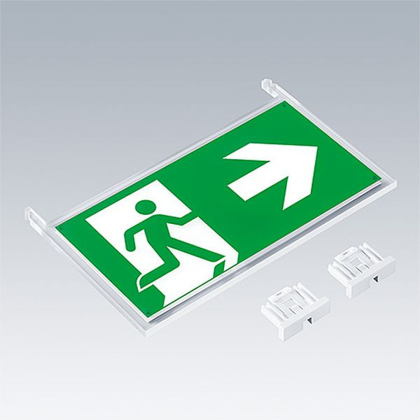 Set mit Einsteckpiktogrammen, Sichtweite: EN - 30 m, um Voyager One-Leuchte in Fluchtwegeleuchte umzuwandeln. Inklusive montierbare ISO 7010-Richtungszeichen (links, rechts, aufwärts, abwärts und leer) Nur für die Nutzung mit der Voyager One Sockelleuchte vorgesehen. Erfüllt DIN4844 nur bei Verwendung mit HP ECC (96631601), HP ECS (96631602) oder ECC (96631599) / ECS (96631600) mit ANT HC-Linse (96631631).