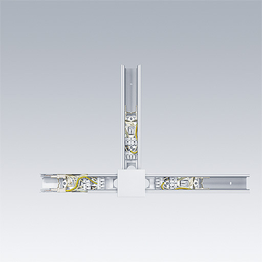 Mechanischer und elektrischer Verbinder, T, weiß. Einschließlich zwei Buchsen und ein Stecker zur mechanischen Verbindung und 3 Anschlussklemm-Gruppen für die Stromein- oder -ausspeisung. Gewicht: 2,9 kg
