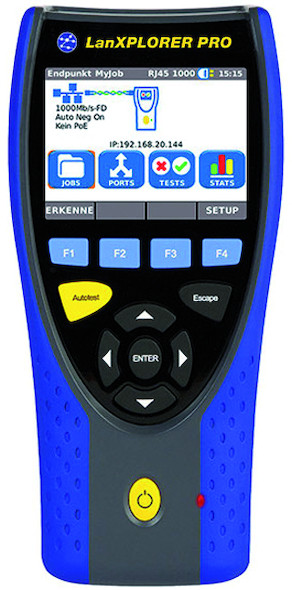 Für Messungen an aktiven Netzen zur Ermittlung von Leistungsraten, Fehlersuche oder Bestimmung der Übertragungsqualität. Einsetzbar an Glasfaser-, Kupfer- oder drahtlosen WLAN-Netzen. Einfache Bedienung mittels Autotest-Funktion: Automatische Erkennung des angeschlossenen Netzwerks und Ausführung der entsprechenden Messungen. Gewonnene Daten werden geräteintern abgespeichert und auf PC zur weiteren Auswertung und Dokumentation exportiert LanXPLORER PRO - für Kupfer-, Glasfaser- und WLAN-Netze, mit Touchscreen.