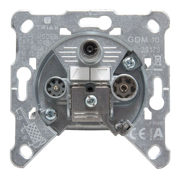 GDM 10 - 3-Loch Multimedia-Durchgangs-Dose3-Wege-Multimediadosen dienen zum Anschluss von TV-Gerät, FM-Radio sowie Datenmodem an moderne BK-Kabelfernsehnetze mit Internetzugang. Die neu entwickelte TRIAX Dosen-Plattform lässt Sie heute Zeit und morgen Geld sparen - die Dosen sind komfortabel zu installieren und sowohl für die aktuellen als auch für erweiterte Anforderungen in der Zukunft bestens gerüstet.Merkmale: Frequenzbereich von 5-1200-1800 MHz für alle Stufen einer zukünftigen DOCSIS-3.1-Migration, kompatibel mit dem gegenwärtigen Betriebsmodus, exzellente Signal-Übertragungseigenschaften, erhöhte Schirmung Klasse A+ 10dB, schnelle und zuverlässige Montage (Steck-Klemme-Technik), geprüft und gelistet z. B. von Vodafone Kabel Deutschland