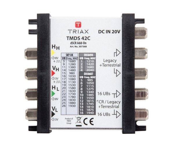 Der Quad- und Quattro-kompatible Mini-SCR/dSCR-Multischalter TMDS 42 C eignet sich ideal als Standalone-Unicable-Lösung oder zur Nachrüstung bestehender Multischalteranlagen. Da der TMDS 42 C Quad-tauglich ist, besteht die Möglichkeit das Gerät hinter einem herkömmlichen Multischalter oder Quad LNB zu betreiben. Merkmale: Erweitert bestehende Systeme ohne aufwändige Neuverkabelung, 2 x feste Legacy-Ausgänge zum Anschluss herkömmlicher Sat-Receiver, 2 x SCR/dSCR/Legacy-Ausgänge mit bis zu 16 Userbändern pro Ausgang, 1 x DC-Eingang (F-Buchse) zur Spannungsversorgung mit externem Netzteil (nicht im Lieferumfang), Automatische Erkennung Legacy/dSCR, Terrestrische Signalverteilung möglich bei Anwendung hinter einem Multischalter, Einheitliche Signalverteilung mit AGC an den Ausgängen (nur im SCR/dSCR Betrieb), Quad / Quattro kompatibel, SkyQ kompatibel (Für den Betrieb des TMDS 42 C wird ein externes Netzteil benötigt TPS 324 PSU, Art.-Nr. 181655)