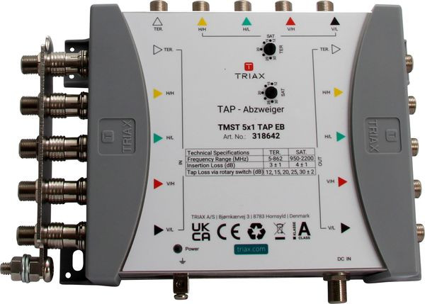 Abzweiger für 5-fach Multischaltersysteme. Der Abzweiger TMS 5x1 TAP ergänzt die Multischalter CKR/TMS 5xxS und ermöglicht die Kaskadierung der Einzelmultischalter.