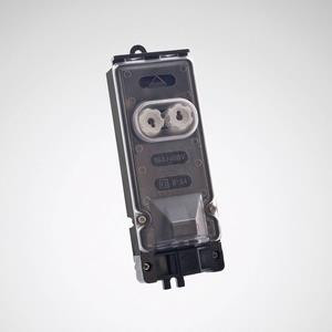 Kabelübergangskasten aus glasfaserverstärktem Polycarbonat. Für drei Kabel max. 5 x 10 mm2 oder zwei Kabel 5 x 16 mm2 (Einspeisung) und zwei Kabel max. 4 x 1,5 mm2 oder ein Kabel max. 4 x 2,5 mm2 (Verbraucher). Mit Zugentlastung. Für zwei Sicherungen bis 16 A (D01/E14). Länge 235 mm, Breite 79 mm, Höhe 65 mm. Schutzklasse (EN 61140): II, Schutzart (DIN EN 60529): IP54.