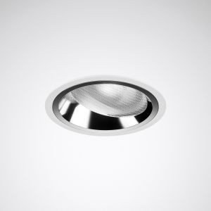 Kompaktes LED-Downlight in runder Bauform. Einbau-Downlight mit Rand für gesägte Deckenöffnungen. Werkzeugloser Deckeneinbau durch Schnellmontagespanner. Deckenausschnittmaß Ø 150 mm. Sanierungsplatten für den Einbau in bereits vorhandene Deckenöffnungen mit unpassenden Maßen sind als separat zu bestellendes Zubehör verfügbar. Einbautiefe >= 130 mm, Leuchtenhöhe 133 mm. Mit hochglänzend bedampftem Kunststoffreflektor. Farbe des Deckeneinbaurahmens: weiß. Symmetrische Lichtverteilungscharakteristik und Halbwertswinkel: Wallwasher. Wandfluter mit asymmetrischer Lichtstärkeverteilung. Lichtlenkung durch Collimator sowie einer lichtlenkenden Prismenscheibe. Mit einem LED-Modul. Leuchtenlichtstrom 2.100 lm, Anschlussleistung 23,0 W, Leuchten-Lichtausbeute 91 lm/W. Lichtfarbe Neutralweiß, ähnlichste Farbtemperatur (CCT) 4000 K, allgemeiner Farbwiedergabeindex (CRI) Ra = 90. Farborttoleranz (initial MacAdam) = 3 SDCM entspricht einer sehr hohen Farbgleichheit der LED in der Anwendung. Mittlere Lebensdauer L90(tq 25 °C) = 50.000 h, mittlere Lebensdauer L80(tq 25 °C) = 100.000 h. Die Lichtquelle ist entsprechend der Ökodesign-Anforderungen (VO (EU) 2019/2020) austauschbar. Zulässige Umgebungstemperatur (ta): -20°C - +25°C. Gehäuse und Kühlkörper aus Aluminium-Druckguss. Schutzklasse (EN 61140): II, Schutzart (DIN EN 60529): IP20. Schutzart raumseitig: IP44. Stoßfestigkeitsgrad nach IEC 62262: IK06, Prüftemperatur Glühdrahttest gemäß IEC 60695-2-11: 850 °C. Mit 5-poliger Anschlussklemme bis 2,5 mm² für Netzanschluss sowie separater 5-poliger Netzweiterleitungsbox. Der netzseitige Anschluss des Vorschaltgerätes erfolgt mittels Anschlussklemme. Mit elektronischem Vorschaltgerät, digital dimmbar (DALI). Betriebsgerät gemäß DALI-2-Standard (EN 62386). Leuchte mittels Tastfunktion über DALI-Steuerklemmen schalt- und dimmbar (Touch DIM). Möglicher Dimmbereich: 1...100%. Das Betriebsgerät ist entsprechend der Ökodesign-Anforderungen (VO (EU) 2019/2020) austauschbar. Live-Link ready. Die Leuchte ist silikonfrei. Das Produkt erfüllt die grundlegenden Anforderungen der anwendbaren EU-Richtlinien und des Produktsicherheitsgesetzes und trägt die CE-Kennzeichnung. Zusätzlich ist die Leuchte durch eine unabhängige Prüfstelle ENEC-zertifiziert. Für Arbeitsplätze mit Bildschirmgeräten. Büros, Flure, Foyers, Konferenzräume, Verkaufsflächen, Wartezonen. Mit Trilux-Nachkaufversprechen: Die Leuchte ist 10 Jahre, Ersatzteile (LED-Modul, Betriebsgerät und optisches System) 15 Jahre nach Rechnungsdatum verfügbar. Vertretbare Änderungen, die dem Fortschritt dienen, sind dabei vorbehalten.