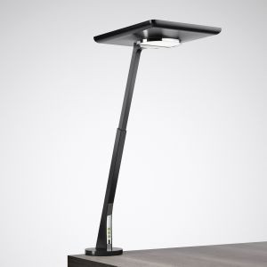 Innovative Tischleuchte mit direktem Lichtanteil für individuelle Arbeitsplatzausleuchtung und indirektem Lichtanteil für allgemeine Raumausleuchtung. Mit integriertem Lichtmanagement zur synchronen tages- und jahreszeitabhängigen Steuerung der Lichtfarbe (Circadian-Steuerung) beider Lichtaustrittsebenen. Mit der integrierten Smart-Connect-Funktion lassen sich bis zu 20 Leuchten zu einer Leuchtengruppe zusammenfassen und steuern. Die Bedienung der Beleuchtungsfunktionen erfolgt manuell durch 3 Bedienelemente sowie mittels Smartphone-App. Mit Smart-Connect-Ausstattung. Die Leuchte verfügt über einen integrierten Tageslicht- und HF-Präsenzsensor mit Bewegungsrichtungserkennung. Bis zu 20 Leuchten in Smart-Connect-Ausführung können innerhalb eines Raumes über Bluetooth zu einer interaktiven Leuchtengruppe miteinander verbunden werden. Die Ersterkennung von Bewegung bei einer beliebigen Leuchte innerhalb der Gruppe bewirkt das Einschalten aller Gruppenteilnehmer auf Grundlichtniveau (ca. 300 lx, Indirektanteil). Eine nachfolgende Erfassung im Nahbereich einer Leuchte steuert diese durch Einschalten des Direktanteils in den Arbeitsplatzmodus. Innerhalb der Leuchtengruppe wird die Lichtfarbe und HCL Kurve des Indirektanteils harmonisiert. Die Parametrierung der Smart-Connect-Funktionen erfolgt passwortgeschützt mittels Smartphone über eine App. Die Kommunikation zwischen den verbundenen Leuchten und dem Smartphone erfolgt mittels Bluetooth Low Energy v 5.0. Besonders geeignet für die Ausstattung moderner Büroumgebungen, speziell in Open Space Anwendungen und offenen Kommunikationszonen als Tischleuchte für alle Arten von festen und höhenverstellbaren Schreib-, Besprechungs- und Arbeitstischen. Für die anforderungsorientierte, den Arbeitsschutzbestimmungen entsprechende Beleuchtung auch im Bereich der Home Office Anwendungen. Auch geeignet für Arbeitsbereiche mit geringer Tageslichtversorgung. Mit Tischklemme zur Befestigung der Leuchte am Rand einer massiven, tragfähigen Oberfläche mit einer Materialstärke von 15 mm bis 50 mm und ca. 100 mm Klemmtiefe. Die Leuchte ist um 180° drehbar. Die Oberfläche des Befestigungsbereiches ist durch einen Gummipuffer geschützt. Triple Glare Control System (TGCS®) für einen blendungsreduzierten, symmetrisch strahlenden Indirektanteil mit begrenztem Ausstrahlwinkel. Mit klarer, hochkratzfester Acryl-Abschlußscheibe. Mit symmetrisch begrenzt breit strahlender Lichtstärkeverteilung. Blendungsbewertung nach UGR-Einstufung (EN 12464-1) < 19. Mit Tunable White Technologie zur Steuerung der Lichtfarbe mittels separatem Steuersystem (DT8). Bemessungslichtstrom 5580 lm, Bemessungsleistung 52 W, maximale Leuchten-Lichtausbeute 107 lm/W. Aufteilung des Leuchten-Lichtstroms Indirekt-/Direktanteil 90% / 10 %. Lichtfarbe Tunable White (warmweiß - tageslichtweiß), ähnlichste Farbtemperatur (CCT) Tunable White (2700 K - 6000 K), allgemeiner Farbwiedergabeindex (CRI) Ra > 80. Farborttoleranz (initial MacAdam) = 3 SDCM. Mittlere Bemessungslebensdauer L80 (tq 25 °C) = 50.000 h. Flimmern: Pst LM = 1,0 bei Volllast. Stroboskop-Effekt: SVM = 0,4 bei Volllast. Leuchtenkörper aus Aluminium-Druckguss. Oberfläche schwarz beschichtet (ähnlich RAL 9005). Bedienelemente verchromt. Maße des Leuchtenkopfes (L x B x H) 320 mm x 240 mm, Leuchtenhöhe (stufenlos einstellbar) 500 mm - 650 mm. Schutzklasse (EN 61140): II, Schutzart (DIN EN 60529): IP20, Stoßfestigkeitsgrad nach IEC 62262: IK02, Prüftemperatur Glühdrahttest gemäß IEC 60695-2-11: 650 °C. Zulässige Umgebungstemperatur (ta): 25 °C Gewicht: 3,2 kg. Steckernetzteil mit Anschlusslei