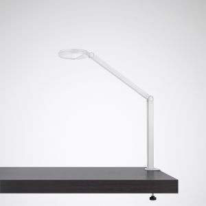 Kompakte Tischleuchte mit einem flachen, runden Leuchtenkopf, drei Justiergelenken und Befestigungsklemme. Die Steuerung der Leuchte erfolgt über die Bedienelemente am Leuchtenkopf. Mit Comfort-Ausstattung. Geeignet zur Beleuchtung einer Fläche RF3 nach DIN 5035-8 mit bis zu 500lx ohne Zusatzbeleuchtung. In Verbindung mit Allgemeinbeleuchtung (500lx) werden für bürospezifische Sehaufgaben modifizierte Beleuchtungsstärken nach DIN EN 12464-1:2021 von bis zu 1000lx auf der Fläche RF3 erreicht. Mit Tischklemme zur Befestigung der Leuchte am Rand einer massiven, tragfähigen Oberfläche mit einer Materialstärke von 20 mm - 75 mm und ca. 100 mm Klemmtiefe. Die Leuchte ist um 180° drehbar. Die Oberfläche des Befestigungsbereiches ist durch einen Gummipuffer geschützt. Mit prismierter Abdeckung für optimale Lichtverteilung. Mit asymmetrisch breit strahlender Lichtstärkeverteilung. Leuchtenlichtstrom und Lichtfarbe fest eingestellt. Bemessungslichtstrom 700 lm, Bemessungsleistung 7,7 W, maximale Leuchten-Lichtausbeute 91 lm/W. Lichtfarbe neutralweiß, ähnlichste Farbtemperatur (CCT) 4000 K, allgemeiner Farbwiedergabeindex (CRI) Ra > 90. Farborttoleranz (initial MacAdam) = 3 SDCM. Mittlere Bemessungslebensdauer L80 (tq 25 °C) = 50.000 h. Die Lichtquelle ist entsprechend der Ökodesign-Anforderungen (VO (EU) 2019/2020) austauschbar. Flimmern: Pst LM = 1,0 bei Volllast. Stroboskop-Effekt: SVM = 0,4 bei Volllast. Leuchtenkörper aus Aluminium-Druckguss. Oberfläche weiß beschichtet (ähnlich RAL 9016). Maße des Leuchtenkopfes (L x B x H) Ø 134 mm x 23 mm, Leuchtenhöhe (stufenlos einstellbar) 390 mm - 715 mm. Schutzklasse (EN 61140): II, Schutzart (DIN EN 60529): IP20, Stoßfestigkeitsgrad nach IEC 62262: IK02, Prüftemperatur Glühdrahttest gemäß IEC 60695-2-11: 650 °C. Zulässige Umgebungstemperatur (ta): 25 °C Gewicht: 1,4 kg. Das Steckernetzteil (Euro-Anschlusstecker Typ C, EN 50075) ist mit einer Anschlussleitung und Kupplung zur Verbindung mit der Leuchtenleitung ausgestattet. Die Leitungsführung erfolgt komplett innerhalb des Leuchtenkörpers, die Anschlussleitung wird über eine Kunststoffverklemmung sicher ausgeführt. Die rückseitig ausgeführte Anschlussleitung (1500 mm) wird mittels Steckverbindung mit der Anschlussleitung des Netzteils (1500 mm) verbunden. Die Gesamtleitungslänge des Anschlusses beträgt 3000 mm. Mit elektronischem Betriebsgerät, dimmbar (integriert) Das Betriebsgerät ist entsprechend der Ökodesign-Anforderungen (VO (EU) 2019/2020) austauschbar. Bedienung über 2 Taster (Ein/Aus/Helligkeit). Das Produkt erfüllt die grundlegenden Anforderungen der anwendbaren EU-Richtlinien und des Produktsicherheitsgesetzes und trägt die CE-Kennzeichnung. Zusätzlich ist die Leuchte durch eine unabhängige Prüfstelle ENEC-zertifiziert. Leuchte 10 Jahre, Ersatzteile (LED-Modul, Betriebsgerät, optisches System) 15 Jahre nach Rechnungsdatum unter Vorbehalt vertretbarer Änderungen, die dem Fortschritt dienen, verfügbar.