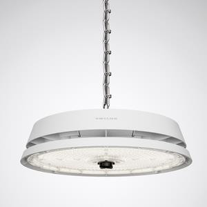 Robuster LED-Hallenstrahler mit Zhaga-Schnittstelle. Mit SLR-Ausstattung (Smart Lighting Ready) zur nachträglichen Integration von Komponenten für Lichtmanagementsysteme. Der standardisierte Sockel nach Zhaga ist mittig in die Leuchtenoptik integriert. Die Leuchte ist für den D4i-Standard ausgelegt. Geeignet zur Anwendung in HACCP, IFS und/oder BRC Global Standard Food zertifizierten Unternehmen. Mit begrenzter Oberflächentemperatur, für den Einsatz in feuergefährdeten Räumen gemäß DIN EN 60598-2-24 geeignet. Zur Decken-, Wand- oder abgehängten Montage mit separat zu bestellendem Zubehör geeignet. Mit symmetrisch breit strahlender Lichtstärkeverteilung. Leuchtenlichtstrom und Lichtfarbe fest eingestellt. Bemessungslichtstrom 35000 lm, Bemessungsleistung 189 W, maximale Leuchten-Lichtausbeute 185 lm/W. Lichtfarbe neutralweiß, ähnlichste Farbtemperatur (CCT) 4000 K, allgemeiner Farbwiedergabeindex (CRI) Ra > 80. Farborttoleranz (initial MacAdam) = 3 SDCM. Mittlere Bemessungslebensdauer L80 (tq 35 °C) = 100.000 h, L80 (tq 50 °C) = 70.000 h. Die Lichtquelle ist entsprechend der Ökodesign-Anforderungen (VO (EU) 2019/2020) austauschbar. Flimmern: Pst LM = 1,0 bei Volllast. Stroboskop-Effekt: SVM = 0,4 bei Volllast. Rotationssymmetrischer Aluminium-Druckguss-Körper. Mit abgesetzter Kontur für optimales Thermomanagement und hohe Luftzirkulation. Oberfläche weiß beschichtet (ähnlich RAL 9016). Weitere Farben auf Anfrage erhältlich. Leuchtendurchmesser Ø 421 mm, Leuchtenhöhe 169 mm. Schutzklasse (EN 61140): I, Schutzart (DIN EN 60529): IP65, Stoßfestigkeitsgrad nach IEC 62262: IK08, Prüftemperatur Glühdrahttest gemäß IEC 60695-2-11: 850 °C. Zulässige Umgebungstemperatur (ta): -30 °C bis 50 °C. Gewicht: 6,7 kg. Der Anschluss der Leuchte erfolgt ohne Öffnen des Leuchtenkörpers durch die nach außen ausgeführte Anschlussleitung. Länge der Anschlussleitung 1,5 m. Mit elektronischem Betriebsgerät, schaltbar. Das Betriebsgerät ist entsprechend der Ökodesign-Anforderungen (VO (EU) 2019/2020) austauschbar. Die Leuchte ist Monitoring ready (MOR) und liefert Leuchtendaten zur Überwachung oder vorausschauenden Wartung. Sie ist damit kompatibel zu den TRILUX Monitoring Services. Das Produkt erfüllt die grundlegenden Anforderungen der anwendbaren EU-Richtlinien und des Produktsicherheitsgesetzes und trägt die CE-Kennzeichnung. Leuchte 10 Jahre, Ersatzteile (LED-Modul, Betriebsgerät, optisches System) 15 Jahre nach Rechnungsdatum unter Vorbehalt vertretbarer Änderungen, die dem Fortschritt dienen, verfügbar.
