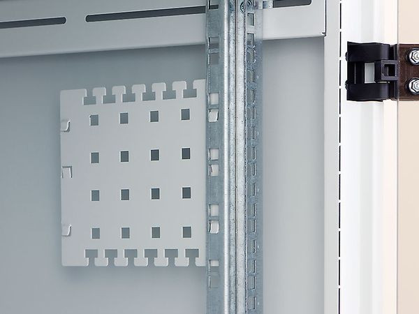 Spezielle Kabelführungsplatte Die Kabelführungsplatte ist für die Installation an den vertikalen Rasterschienen des Verteilers bestimmt. Sie kann auch an der vertikalen Perforation im hinteren Teil der Wandverteiler montiert werden.