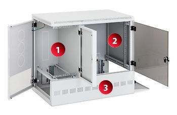verstellbar. Kabeleinführungen mit Ausbruchblenden befi nden sich in der Rückwand, im Dach und Boden. Kabel zwischen den einzelnen Sektionen können durch die zentrale Trennwand geführt werden.