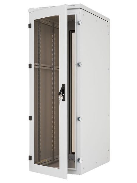 Geschweißter Standschrank für Belastung 800 kg, in Stahlblechausführung, IP 54. Verblendete Kabeldurchführungen im Dach-und Bodenteil. Alle Teile zusammengeerdet. Sternpunkt vormontiert, zwei Paar (ab Schranktiefe 900 mm drei Paar) 19“ vertikale Montageschienen, verzinkt, verstellbar. Alle Höheneinheiten an den Montageschienen gekennzeichnet und gegenläufig durchnummeriert.