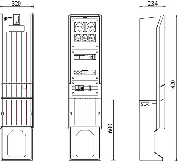 MV-A010-02, Verteilersäule Größe A010/1420, eine Einspeiseklemme, eine Hauptsicherung D02, 3 polig, ein Fehlerstromschutzschalter, 4 polig, ein Fehlerstromschutzschalter, 4 polig, ein Leitungsschutzschalter C 16 A 3 polig, ein Leitungsschutzschalter C 32 A 3 polig, drei Leitungsschutzschalter B 16 A 1 polig, eine CEE-Steckdose, 16 A, 5 polig, eine CEE-Steckdose, 32 A, 5 polig, drei CEE-Steckdosen 16 A, 3 polig, eine Sockelblende für Kabeldurchführung