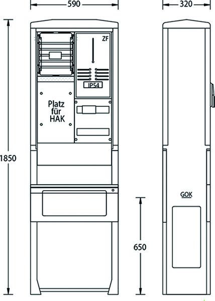 Größe 0 / A070-1850, Schutzklasse II, mit Doppelschließung inkl. Profilhalbzylinder 40 mm, Platz für Hausanschlusskasten NH00, 1 Zählerplatz IP54 nach DIN 43 870, Platz für Hauptsicherungsautomaten Typ ABB-S750, GE/AEG-S91.3, HAGER-HTS auf SS-System 5 pol./12x5 mm Cu., Leerfeld für Reiheneinbaugeräte 12 TE, Abgang mit Hauptleiterabzweigklemme 1,5 - 25 mm2 , 5 pol., Eingrabtiefe: 650 mm