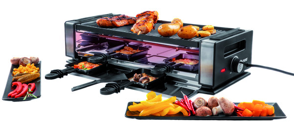 wendbare Grillplatte aus Druckguss-Aluminium mit Greblon® Antihaftbeschichtung mit glatter und geriffelter Oberfläche (ca. 38 x 19,5 cm), antihaftbeschichtete Pfännchen mit Cool-Touch Handgriff, 8 Kunststoffspatel, integrierte und ausziehbare Edelstahl-Pfännchenablage, stufenlose Temperaturregelung mit Kontrollleuchte, Halterung für optional erhältliche Dunstabzugshaube