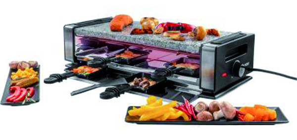 rechteckige Naturstein-Grillplatte (ca. 38 x 19,5 cm) und zusätzlich wendbare Grillplatte aus Druckguss-Aluminium mit Greblon® Antihaftbeschichtung mit glatter und geriffelter Oberfläche (ca. 38 x 19,5 cm), antihaftbeschichtete Pfännchen mit Cool-Touch Handgriff, 8 Kunststoffspatel, integrierte und ausziehbare Edelstahl-Pfännchenablage, stufenlose Temperaturregelung mit Kontrollleuchte, Halterung für optional erhältliche Dunstabzugshaube