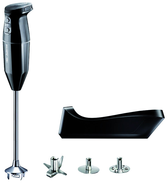 kabellos, mit leistungsstarkem, entnehmbarem Li-Ion Akku, 2 Stufen: 8.000/14.000 U/min., Booster-Funktion 15.500 U/min., Sicherheits-Twinschalter, Aufsteck-Zentrierung erleichtert das Aufstecken der Zubehörteile, längere Antriebswelle für eine Flüssigkeitsmenge von 30 l (bei ca. 45 cm Gefässdurchmesser), Multimesser, Schlagscheibe, Quirlscheibe, Sleep-Funktion (nach 60 Sek. ohne Benutzung schaltet sich das Gerät automatisch ab), Ladestandanzeige, Ladestation