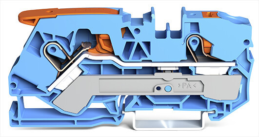 2-Leiter-Durchgangsklemme; mit Hebel und Drücker; 10 mm²; mit Prüföffnung; für Anwendungen Ex i geeignet; seitliche und mittige Beschriftung; für Tragschiene 35 x 15 und 35 x 7,5; Push-in CAGE CLAMP®; 10,00 mm²; blau