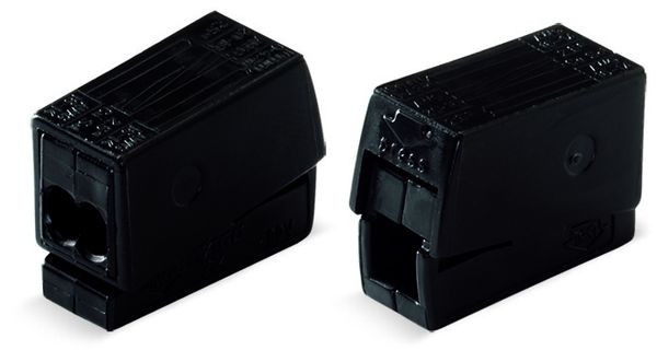 2-Leiter-Leuchtenklemme; Drücker Leuchtenseite; Leuchtenseite: für alle Leiterarten; Inst.-Seite: für eindrähtige Leiter; Serie 224; max. 2,5 mm²; Umgebungstemperatur max. 75 °C; 2,50 mm²; schwarz
