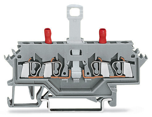 2-Leiter-Trenn- und Messklemme; ohne schwenkbaren Trennmesser; mit berührungssicheren Prüfbuchsen; Prüfbuchse rot; für Tragschiene 35 x 15 und 35 x 7,5; 2,5 mm²; CAGE CLAMP®; 2,50 mm²; grau