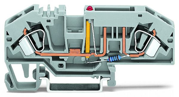 2-Leiter-Sicherungsklemme; für Kfz-Flachsicherungen; mit Prüfmöglichkeit; mit Defektanzeige durch LED; 24 V; für Tragschiene 35 x 15 und 35 x 7,5; 6 mm²; CAGE CLAMP®; grau