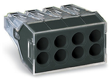 Verbindungsdosenklemme; für ein- und mehrdrähtige Leiter; max. 2,5 mm²; 8 Leiter; Gehäusefarbe transparent; Deckelfarbe dunkelgrau; Umgebungstemperatur max. 60°C; 2,50 mm²; transparent