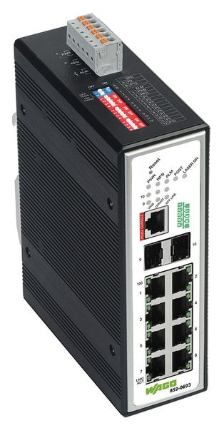 Der 852-603 ist ein industrieller, konfigurierbarer Managed-ETHERNET-Switch mit 8 Kupfer-Ports 10/100BASE-TX und 2 SFP-Slots die wahlweise als 100BASE-FX oder 1000BASE-SX/LX konfigurierbar sind (SFP-Module sind optional erhältlich). Der Switch besitzt ein robustes Gehäuse, eine redundante Spannungsversorgung und eine Funktionsüberwachung mit Relais. Das PROFINET-Zertifikat (Konformitätsklasse B) garantiert eine einfache Integration in PROFINET-Automatisierungssysteme mittels Gerätebeschreibungsdatei (GSD). Außerdem unterstützt das Gerät die PROFINET Netload Class II. Das Gerät ünterstützt eine flexible Konfiguration der Multi-Portspiegelung über die Gerätebeschreibungsdatei oder dem Web-Based-Management. Mit Hilfe von Funktionsbausteinen kann die zyklische Diagnose des PROFINET-Switches im TIA-Portal effizient implementiert werden. Hierfür steht ein Anwendungshinweis zur Verfügung. Eigenschaften: