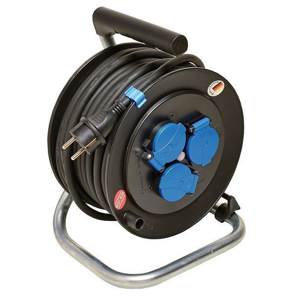 | Kurzbeschreibung | Sicherheits-Kabeltrommel 230V mit 3 Schutzk.-Steckdosen und Anschluss über 25m Gummischlauchleitung H07RN-F3G1,5 mit Schutzk.-Stecker |