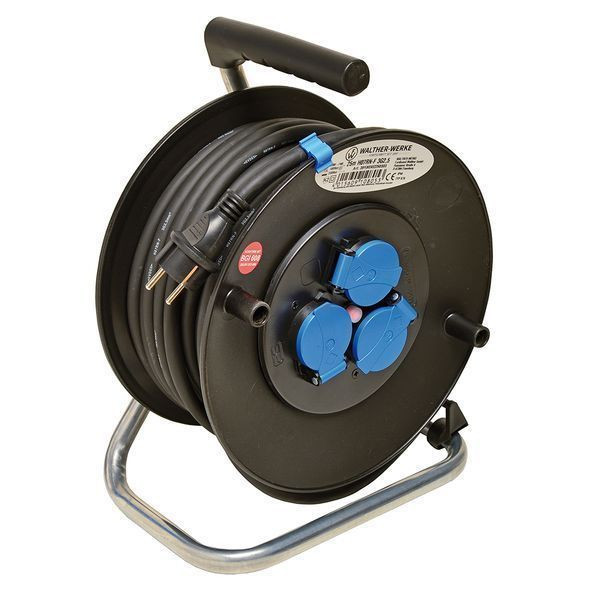 | Kurzbeschreibung | Sicherheits-Kabeltrommel 230V mit 3 Schutzk.-Steckdosen und Anschluss über 25m Gummischlauchleitung H07RN-F3G2,5 mit Schutzk.-Stecker |