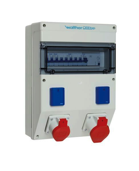 WALTHER Kunststoff-Steckdosenkombinationnach IEC 61439-Teil 1 und 3Gehäuse (682) aus silikon- und halogenfreiem PC/ABS Farbe: ähnlich RAL 7035 -lichtgrau- mit oben einrastendem KlarsichtdeckelSchutzklasse IIBrennbarkeitsklasse V0Schutzart: IP44Größe ca.: 404 x 290 x 171mm / H-B-T Anschluss:3 Vorprägungen oben und unten M40/M501 Klemmsatz K25 10P Abgänge/ Absicherung:1 Fehlerstromschutzschalter (RCD) 4P 40A/30mA -A-1 CEE-Anbaudose gerade 32A 5P 400V 6h mit Leitungsschutzschalter (MCB) 3P 32A -C-1 CEE-Anbaudose gerade 16A 5P 400V 6h mit Leitungsschutzschalter (MCB) 3P 16A -C-2 Schutzkontaktsteckdosen 16A 3P 230V mit je 1 Leitungsschutzschalter (MCB) 1P 16A -C- Steckdosenkombination nach DIN EN 61439:stückgeprüftanschlussfertig verdrahtetBemessungsstrom: 40A