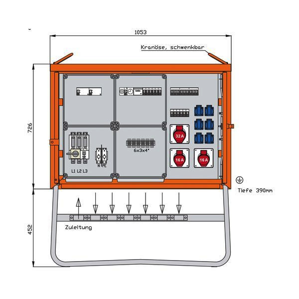 WALTHER BeleuchtungsverteilerAnschlussleistung: 44kVAnach IEC61439-4Gehäuse (H28BE) aus elektrolytisch-verzinktem Stahlblech mit schwermetallfreier Kunststoff-Lackierung Farbe: RAL 2004 -reinorange- mit Kranösen mit Doppeltür und 3-Punkt Stangenschloss mit Drehknauf und Vorrichtung für Vorhängeschloss inkl. feuerverzinktem Untergestell mit Ösen für ErdnägelEinbauten bis einschließlich RCD-Schutzschalter im IsolierstoffgehäuseSchutzart: IP 44Größe ca.: 726 x 1053 x 390mm / H-B-T + Untergestell-Höhe ca.: 452mmAnschluss:1 NH00-Lasttrennschalter mit Sicherungen 63A mit Bügelklemmen 10-50qmmAbgang / Absicherung:1 RCD-Schutzschalter 4P 63A/30mA -B-1 CEE-Anbaudose 32A 5P 400V 6h mit Leitungsschutzschalter (MCB) 3P 32A -C-2 CEE-Anbaudosen 16A 5P 400V 6h mit je 1 Leitungsschutzschalter (MCB) 3P 16A -C-6 Schutzkontaktsteckdosen 16A 2P 230V mit je 1 Leitungsschutzschalter (MCB) 1P 16A -C- 1 RCD-Schutzschalter 4P 40A/30mA -A-1 Sicherungselement 1P 6A D01 -als Steuersicherung- 1 digitale Zeitschaltuhr 1 H-O-A-Schalter1 Schütz 3P 40A 6 Leitungsschutzschalter (MCB) 1P 16A -B- mit je 1 Abgangsklemme 3 x 4qmm