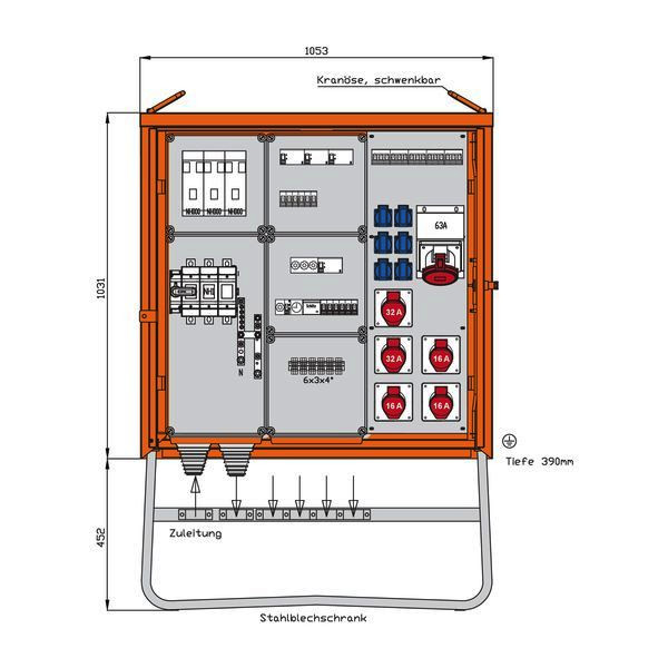 WALTHER BeleuchtungsverteilerschrankAnschlussleistung: 111kVAnach IEC61439-4Gehäuse (H29BE) aus elektrolytisch-verzinktem Stahlblech mit schwermetallfreier Kunststoff-Lackierung Farbe: RAL 2004 -reinorange- mit Kranösen mit Doppeltür und 3-Punkt Stangenschloss mit Drehknauf und Vorrichtung für Vorhängeschloss inkl. feuerverzinktem Untergestell mit Ösen für ErdnägelEinbauten bis einschließlich RCD-Schutzschalter im IsolierstoffgehäuseSchutzart : IP 44Größe ca.: 1031 x 1053 x 390mm / H-B-T + Untergestell-Höhe ca.: 452mmAnschluss:1 NH1-Lasttrennschalter mit Sicherungen 160A mit Bolzenanschluss M10Abgang / Absicherung:1 RCD-Schutzschalter 4P 63A/300mA -B- mit NH000-Sicherungslasttrennschalter 63A1 CEE-Anbaudose 63A 5P 400V 6h ohne Vorsicherung -direkt ab RCD-1 RCD-Schutzschalter 4P 63A/30mA -B- mit NH000-Sicherungslasttrennschalter 63A2 CEE-Anbaudosen 32A 5P 400V 6h mit je 1 Leitungsschutzschalter (MCB) 3P 32A -C-3 CEE-Anbaudosen 16A 5P 400V 6h mit je 1 Leitungsschutzschalter (MCB) 3P 16A -C-1 RCD-Schutzschalter 4P 40A/30mA -A- mit NH000-Sicherungslasttrennschalter 35A6 Schutzkontaktsteckdosen 16A 2P 230V mit je 1 Leitungsschutzschalter (MCB) 1P 16A -C- 1 Lasttrennschalter mit Sicherungen 3P 35A D021 RCD-Schutzschalter 4P 40A/30mA1 Sicherungselement 1P 6A D01 -als Steuersicherung- 1 digitale Zeitschaltuhr 1 H-O-A-Schalter1 Schütz 3P 40A 6 Leitungsschutzschalter (MCB) 1P 16A -B- mit je 1 Abgangsklemme 3 x 4qmm