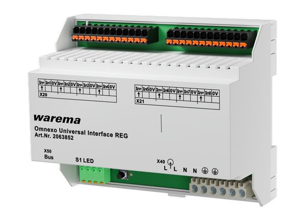 8 frei parametrierbare Eingänge:Integration von konventionellen WAREMA MesswertgebernAnschluss von Tastern oder Schaltern zur Gruppenbedienung, Modi-Umschaltung, Aktivierung von Komfortautomatiken oder GLT-Funktionenfreie Zuordnung der Eingänge zu den Produkten oder Automatikenbis zu 16 Universal Interfaces in einem Omnexo System möglichZuordnung der angeschlossenen Sensoren und Taster über die Omnexo studio Software