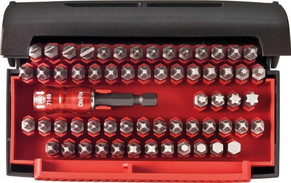 Gehäuse: Robuste Box aus hochfestem Kunststoff. Anwendung: Durch Handgriff und Bithalter sofort sowohl für Maschinen- als auch für Handbetrieb einsetzbar. Bithalter: CentroFix Force Schnellwechselhalter, magnetisch. Bits: 25 mm Standard-Bits. Gehäuse: Auf Knopfdruck öffnet sich die Box automatisch. Griff: Wiha SoftFinish® Mehrkomponenten-Griff, magnetisch, mit Bitaufnahme 1/4Zoll. DIN 3126, ISO 1173, Form C6,3 Inhalt: 1x Bit Standard 25 mm Schlitz 1/4 C6,3 4,5 ,mm (01623) 1x Bit Standard 25 mm Schlitz 1/4 C6,3 5,5 ,mm (01624) 1x Bit Standard 25 mm Schlitz 1/4 C6,3 6,5 ,mm (01626) 1x Bit Standard 25 mm Schlitz 1/4 C6,3 8,0 ,mm (01627) 7x Bit Standard 25 mm Phillips 1/4 C6,3 PH1 (01657) 13x Bit Standard 25 mm Phillips 1/4 C6,3 PH2 (01658) 3x Bit Standard 25 mm Phillips 1/4 C6,3 PH3 (01659) 7x Bit Standard 25 mm Pozidriv 1/4 C6,3 PZ1 (01688) 13x Bit Standard 25 mm Pozidriv 1/4 C6,3 PZ2 (01689) 3x Bit Standard 25 mm Pozidriv 1/4 C6,3 PZ3 (01690) 1x Bit Standard 25 mm innensechsrund 1/4 C6,3 T10 (01716) 1x Bit Standard 25 mm innensechsrund 1/4 C6,3 T15 (01717) 1x Bit Standard 25 mm innensechsrund 1/4 C6,3 T20 (01718) 1x Bit Standard 25 mm innensechsrund 1/4 C6,3 T25 (01719) 1x Bit Standard 25 mm innensechsrund 1/4 C6,3 T30 (01721) 1x Bit Standard 25 mm innensechsrund 1/4 C6,3 T40 (01722) 1x Bit Standard 25 mm Sechskant 1/4 C6,3 3,0 ,mm (01705) 1x Bit Standard 25 mm Sechskant 1/4 C6,3 4,0 ,mm (01706) 1x Bit Standard 25 mm Sechskant 1/4 C6,3 5,0 ,mm (01707) 1x Bit Standard 25 mm Sechskant 1/4 C6,3 6,0 ,mm (01708) 1x Bithalter CentroFix Force mechanisch verriegelbar 1/4 , magnetisch in Box 60 ,mm (39133) 1x Collector Box