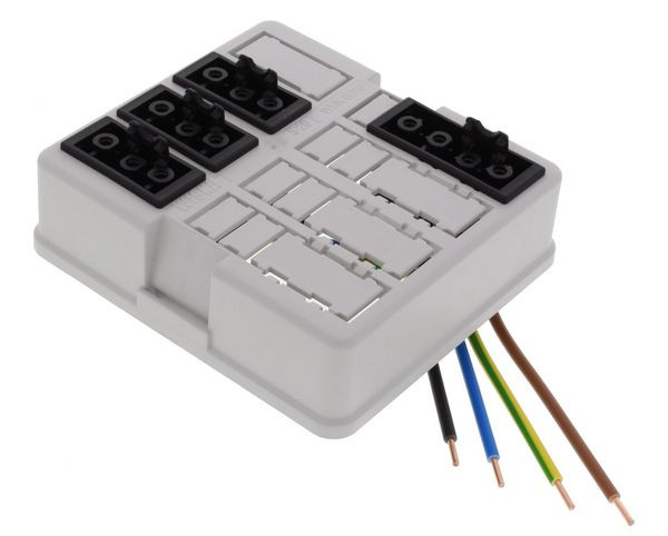 Durch die Verwendung von vorinstallierten Installationssteckverbindern ist keine aufwendige Verdrahtung im Innenraum erforderlich. Der Anschluss von Leuchten, Jalousien, Steckdosen und Schaltern an die Stromversorgung erfolgt zeitsparend und effizient über Steckmöglichkeiten im Deckel. Acht Steckplätze erlauben vielfältige Installationssteckverbinder-Kombinationen. Je nach Bedarf können 3-, 4- und 5- polige Installationssteckverbinder der gängigen Hersteller individuell eingesetzt oder vorverdrahtet geliefert werden. Die Steckplätze sind einfach per Hand auszubrechen. Der WHK-Abzweigkasten kann einfach und schnell per Dübel oder Schrauben befestigt werden. Integrierte Aussparungen auf der Rückseite ermöglichen ausserdem eine einfache Klick-Montage. Eine universell einsetzbare Montageplatte sowie ein M 20-Gewinde auf der Rückseite sorgen für zusätzliche Variabilität in der Montage. Leicht abnehmbarer Deckel mit praktischem Schnappverschluss. Acht Ausbrechöffnungen erlauben eine mühelose Kabeleinführung. Diese kann über die Anschlussstutzen KRASS und KRASM erfolgen. Sie sind mit einer Klick-Verbindung oder einem Gewindeanschluss erhältlich. Ausserdem ist die Befestigung von Kabelverschraubungen mit Gegenmuttern möglich.