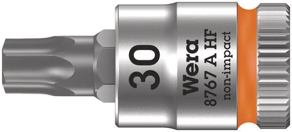8767 A HF innensechsrund Zyklop Bitnuss mit 1/4"-Antrieb, mit Haltefunktion, TX 30 x 28 mmBitnuss mit 1/4" Antrieb und Haltefunktion für besonders komfortables Schrauben mit reduzierter Gefahr des Schraubenverlustes beim Zuführen zum Werkstück. Mit "Take it easy" Werkzeugfinder mit Farbkennzeichnung nach Größen - zum einfachen und schnellen Finden des benötigten Werkzeugs. 05003369001