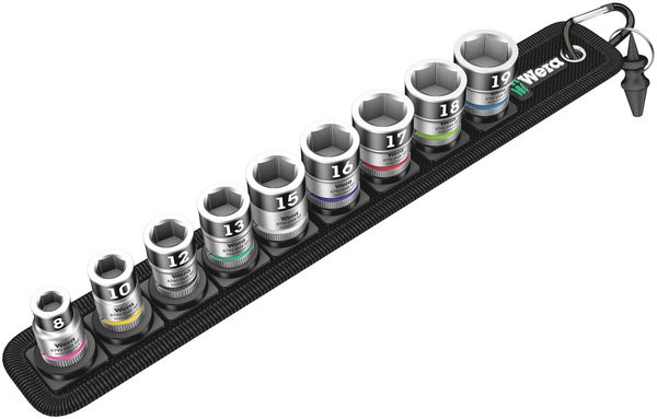 Robuster Textilgurt (Belt) im typischen Wera Design mit 9 Nüssen plus Mutterentnahmewerkzeug auf engstem Raum. Ein leichtgängiger Drehmechanismus sorgt für einen sicheren Halt und leichte Entnahme der Nüsse. Mit Take it easy Werkzeugfinder mit Farbkennzeichnung nach Größen - zum einfachen und schnellen Finden des benötigten Werkzeugs. Inklusive Karabinerhaken zur Befestigung an Gürtelschlaufen oder Taschen. Nüsse mit Haltefunktion für besonders komfortables Schrauben mit reduzierter Gefahr des Schraubenverlustes beim Zuführen zum Werkstück. Mit Vliesrücken und Klettklebestreifen zur einfachen Befestigung z.B. an Wand, Regal, Werkstattwagen und Wera 2go Werkzeugtransportsystem.