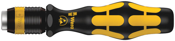 Hochwertiger Bit-Handhalter für elektrostatisch sicheres Arbeiten: Der elektrische Oberflächenwiderstand des Wera ESD Materials liegt bei 10<sup>6</sup> - 10<sup>9</sup> Ohm. So werden Bauteile vor elektrostatischer Energie und damit verbundenen Schäden sicher geschützt. Das Schnellwechselfutter Rapidaptor ermöglicht blitzschnellen Bitwechsel ohne Hilfswerkzeug. Kraftform Plus Griff für angenehm ergonomisches Arbeiten, bei dem Blasen und Schwielen vermieden werden. Harte Griffzonen für hohe Arbeitsgeschwindigkeit, während weiche Griffzonen hohe Drehmomentübertragung garantieren. Geeignet für Bits mit 1/4"-Außensechskantantrieb nach DIN ISO 1173-C 6,3 und E 6,3 (ISO 1173).