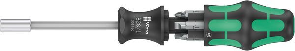 Wera Kompaktwerkzeug mit mehrkomponentigem Kraftform Griff für hohe Arbeitsgeschwindigkeiten und besonders ergonomisches Verschrauben. Im Griff integriertes Bit-Magazin, 6 zähharte Bits für den universellen Einsatz. Bithalter mit starkem Dauermagnet für sicheren Sitz des Bits.