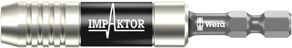 Wera Impaktor Halter zur Abfederung extremer Impulsspitzen. Besonderer Torsionseffekt durch Doppeltorsionsfeder. Der Sprengring garantiert optimalen Sitz des Werkzeugs im Halter. Der Magnet sorgt für zusätzlichen Festsitz von Bit und Schraube. Der Impaktor Edelstahl-Halter mit Sprengring und Magnet wird den extremen dynamischen Anforderungen insofern gerecht, als dass er bewusst auf mechanisch anfälligere Kleinbauteile verzichtet. Einsatz vorwiegend in der industriellen Schraubmontage, z.B. mittels Schraubroboter. Abtrieb: Geeignet für Bits mit 1/4"-Außensechskantantrieb nach DIN ISO 1173-C 6,3. Antrieb: 1/4"-Sechskant, passend für Schraubermaschinen mit Aufnahme nach DIN ISO 1173-F 6,3.
