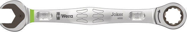 Hochwertiger, metrischer Ringratschen-Maulschlüssel von Wera: Alles, was ein Schlüssel können muss. Und noch viel mehr. Schneller, besser, schöner. Eben ein echter Joker. Die neue Generation der Maul-Ringratschen-Schlüssel. Für Sechskant-Schraubenköpfe bzw. -Muttern. Mit Haltefunktion durch Metallplatte im Maul, die die Gefahr des Verlierens von Schrauben und Muttern reduziert. Die auswechselbare Metallplatte im Maul sichert mit extra harten Zähnen Schrauben und Muttern und reduziert die Abrutschgefahr. Der integrierte Endanschlag kann das Abrutschen vom Schraubenkopf nach unten verhindern und ermöglicht das Aufbringen hoher Drehmomente. Die Doppelsechskantgeometrie sorgt für die formschlüssige Verbindung mit Schraube oder Mutter und damit für die Verringerung der Abrutschgefahr. Ein Rückschwenkwinkel von nur 30° auf der Maulseite vermeidet zeitintensives Wenden des Schlüssels beim Schrauben. Ratschenmechanik auf der Ringseite mit außergewöhnlich hoher Feinverzahnung von 80 Zähnen für Flexibilität auch in engen Bauräumen. Die spezielle Schmiedegeometrie sorgt für hohe Drehmomentübertragung und hohe Biegungssteifigkeit. Gefertigt aus leistungsfähigem Chrom-Molybdän-Stahl mit Nickel-Chrom Beschichtung für hohen Korrosionsschutz. Mit Werkzeugfinder Take it easy: Farbkennzeichnung nach Größen.