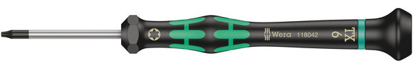 2067 Elektronik innensechsrund Schraubendreher, TX 6 x 40 mm Hochwertiger Wera Micro Schraubendreher für feinmechanische Verschraubungen. Durch Abstützen der Hand auf der Drehkappe und durch die Schnelldrehzone unterhalb der Drehkappe ist blitzschnelles Zwirbeln möglich. Zeitintensives Umgreifen entfällt. Kraftzone mit integrierten Weichzonen sorgt für die Übertragung hoher Löse- und Anzugsmomente. Präzisionszone für den richtigen Drehwinkel bei Justierarbeiten. Die Wera Black Point-Spitze bietet Passgenauigkeit und optimierten Korrosionsschutz. Take it easy Werkzeugfinder mit Farbkennzeichnung nach Profilen und Größenstempelung - zum einfachen und schnellen Finden des benötigten Werkzeugs. 05118042001