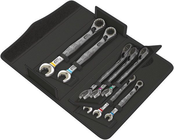 Hochwertiger Ringratschen-Maulschlüssel-Satz von Wera: Joker Maulringratschenschlüssel mit abgewinkelter Ratschenseite und Umschalthebel. Mit Haltefunktion durch Metallplatte im Maul, die die Gefahr des Verlierens von Schrauben und Muttern reduziert. Der integrierte Endanschlag kann das Abrutschen vom Schraubenkopf nach unten verhindern und ermöglicht das Aufbringen hoher Drehmomente. Die auswechselbare Metallplatte im Maul sichert mit extra harten Zähnen Schrauben und Muttern und verringert die Abrutschgefahr. Die Doppelsechskantgeometrie sorgt für die formschlüssige Verbindung mit Schraube oder Mutter und damit ebenso für die Verringerung der Abrutschgefahr. Der geringe Rückschwenkwinkel von nur 30° auf der Maulseite vermeidet zeitintensives Wenden des Schlüssels beim Schrauben. Die umschaltbare Ratschenmechanik auf der Ringseite mit hoher Feinverzahnung (80 Zähne) sorgt für hohe Flexibilität auch in engen Bauräumen. Hörbar präzise Ratschenmechanik. Das robuste zweiteilige Rast-Element ermöglicht darüber hinaus eine extreme Standfestigkeit. Mit um 15° abgewinkelter Ratschenseite für sicheres Arbeiten bei hohen Drehmomenten. Die spezielle Schmiedegeometrie sorgt für hohe Drehmomentübertragung und hohe Biegesteifigkeit. Gefertigt aus leistungsfähigem Chrom-Molybdän-Stahl mit Nickel-Chrom Beschichtung für hohen Korrosionsschutz. Mit Werkzeugfinder Take it easy: Farbkennzeichnung nach Größen.