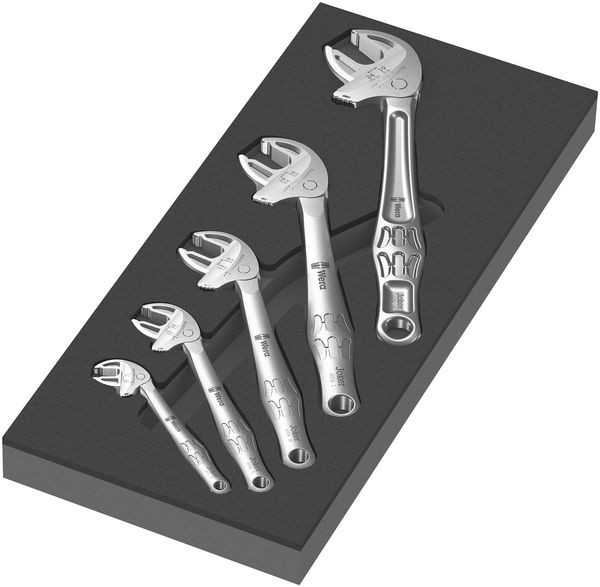 Langlebige Schaumstoffeinlage; 2-farbig zur schnellen Erkennung von fehlenden Teilen; geeignet für den Tool Rebel Werkstattwagen; bestückt mit 5 selbstjustierenden Maulschlüsseln Wera 6004 Joker.