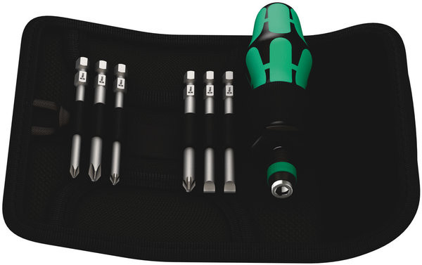 Falttasche mit 89 mm langen Bits. Inklusive Handhalter 816 R Kraftform mit Schnellwechselfutter "Rapidaptor" und mehrkomponentigem Kraftform-Griff für ermüdungsarmes Arbeiten.