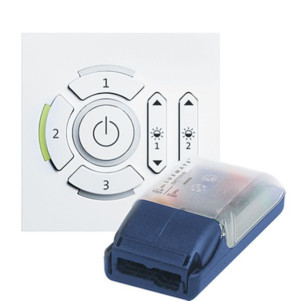 Paket: Bediengerät weiß, Busversorgung, Flexible und kostengünstige Szenen Lichtsteuerung, zur Ansteuerung von bis zu 64 DALI-kompatiblen Betriebsgeräten. Paket besteht aus Bediengerät und Spannungsversorgung. Bediengerät: mit kreisförmig ausgerichteten Tasten zum Aufruf von drei Lichtszenarien. Zentrale, beleuchtete Kommen/Gehen-Taste und zwei Tasterwippen, welchen zwei Leuchtengruppen zugeordnet sind. Gehäuse und Tasten bestehen aus Kunststoff weiß, Oberfläche seidenmatt, Abmessungen: 87 x 87 x 13 mm. Einfache Montage in bauseitige 1-fach Dose. Versorgung über DALI-Steuerleitung (kein Netzanschluss), Strom-Aufnahme 6mA (3 DALI-Lasten). Spannungsversorgung: für bis zu 64 Teilnehmer bzw. 100 DALI-Lasten (max.200mA). Kurzschluss- und spannungsfest gegen 230/240V Fremdspannung. Aus flammwidrigem Polycarbonat, halogenfrei. Montage in Kabelkanälen oder Deckeneinwurf, zulässige Umgebungstemperatur: 0°C bis +50°C. Schutzart IP20, Abmessungen: 101,5 x 29,5mm.