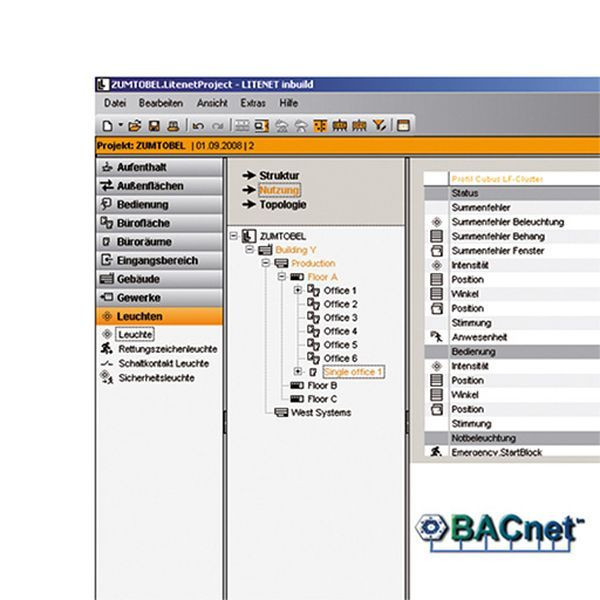 Software Interface 1.000 Datenpunkte für den Datenaustausch der ZUMTOBEL Lichtmanagement Lösung LUXMATE LITENET mit einem System der Gebäudeleittechnik unter Verwendung des offiziellen BACnet Netzwerkprotokolls. (Building Automation and Control Networks Standards) Auszug Datenpunkte: Anlage bedienen: Helligkeit des Kunstlichts einstellen, Position und Lamellenwinkel der Jalousien einstelle, Position der Fenster einstellen, Stimmung abrufen Status anzeigen: Helligkeitseinstellung der Beleuchtung, Position/Lamellenwinkel der Jalousien, Position der Fenster, aktuelle Stimmung LM-4WZS: Regen, Außentemperatur, Windrichtung, Windgeschwindigkeit, Gerätefehler, Störmeldungen, Anwesenheitsmeldungen Notlichtfunktion: Funktionstest in LITENET auslösen, Betriebsdauertest in LITENET auslösen, Notlichtfehler als Summenfehler melden